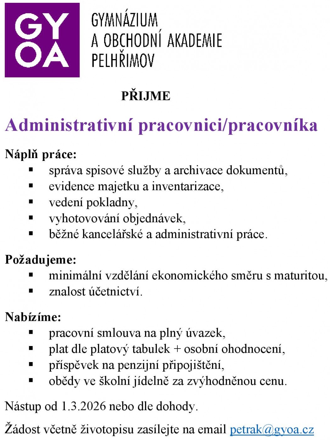 Nacházíte se:AktualityInzerát zaměstnáníInzerát zaměstnáníGYOA přijme administrativní pracovnici/pracovníka.