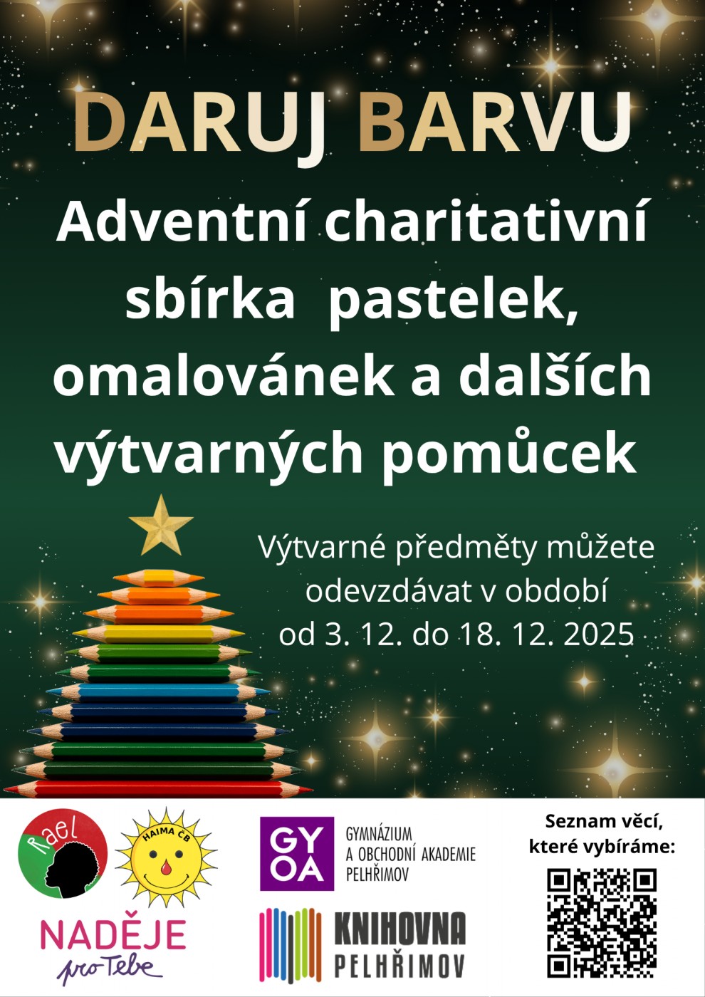 Od 3. do 18. prosince 2025 proběhla ve spolupráci s oddělením beletrie Městské knihovny v Pelhřimově sbírka výtvarných a kreativních potřeb pod názvem „Daruj barvu“. Děkujeme všem štědrým dárcům! Díky nim se z podpory mohou radovat v nadačním fondu Naděje pro Tebe, spolku Haima České Budějovice, v Klokánku Chomutov a také ve školce a škole v Keni, kterou provozuje nezisková organizace Rael.