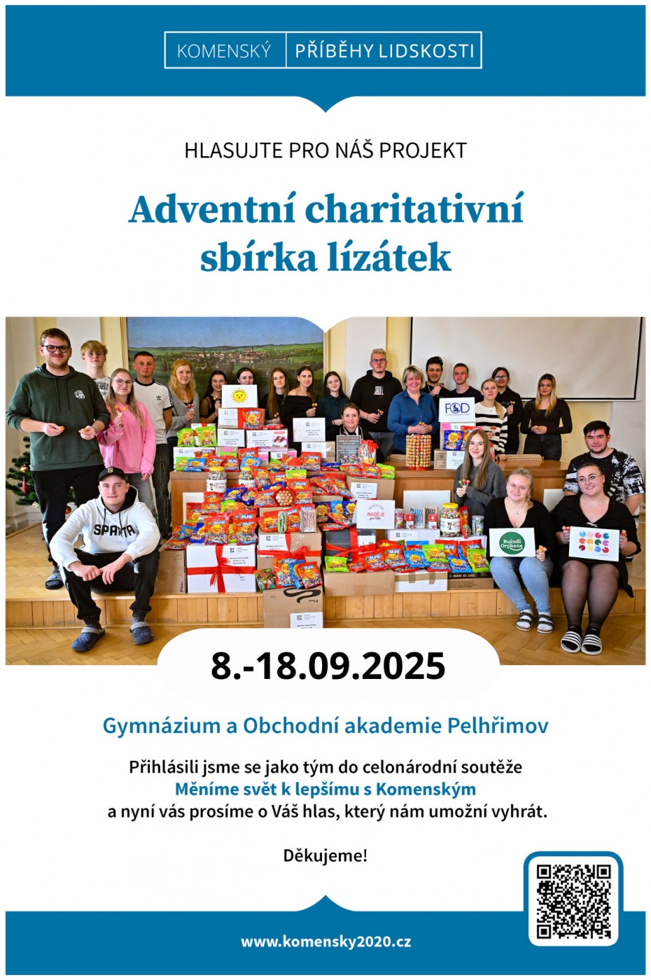 Kromě toho, že sbírka získala ocenění Skutek roku 2024 od Kraje Vysočina, přihlásili jsme ji do soutěže Měníme svět k lepšímu s Komenským. Postoupili jsme mezi pět nejlepších středoškolských projektů v republice. Moc ráda bych Vás požádala o podporu v hlasování za projekt č. 13, a to do půlnoci 18. září 2025.